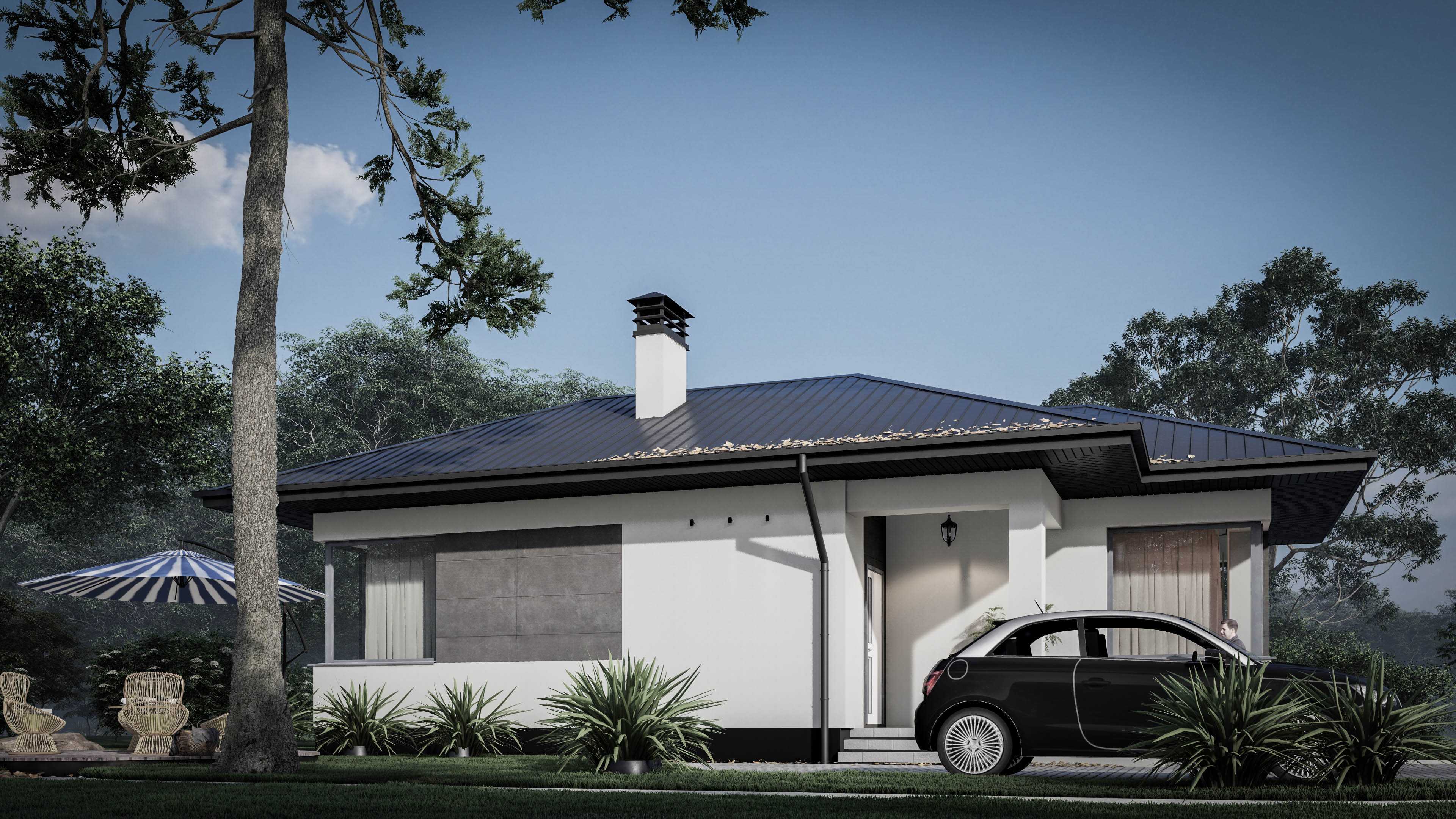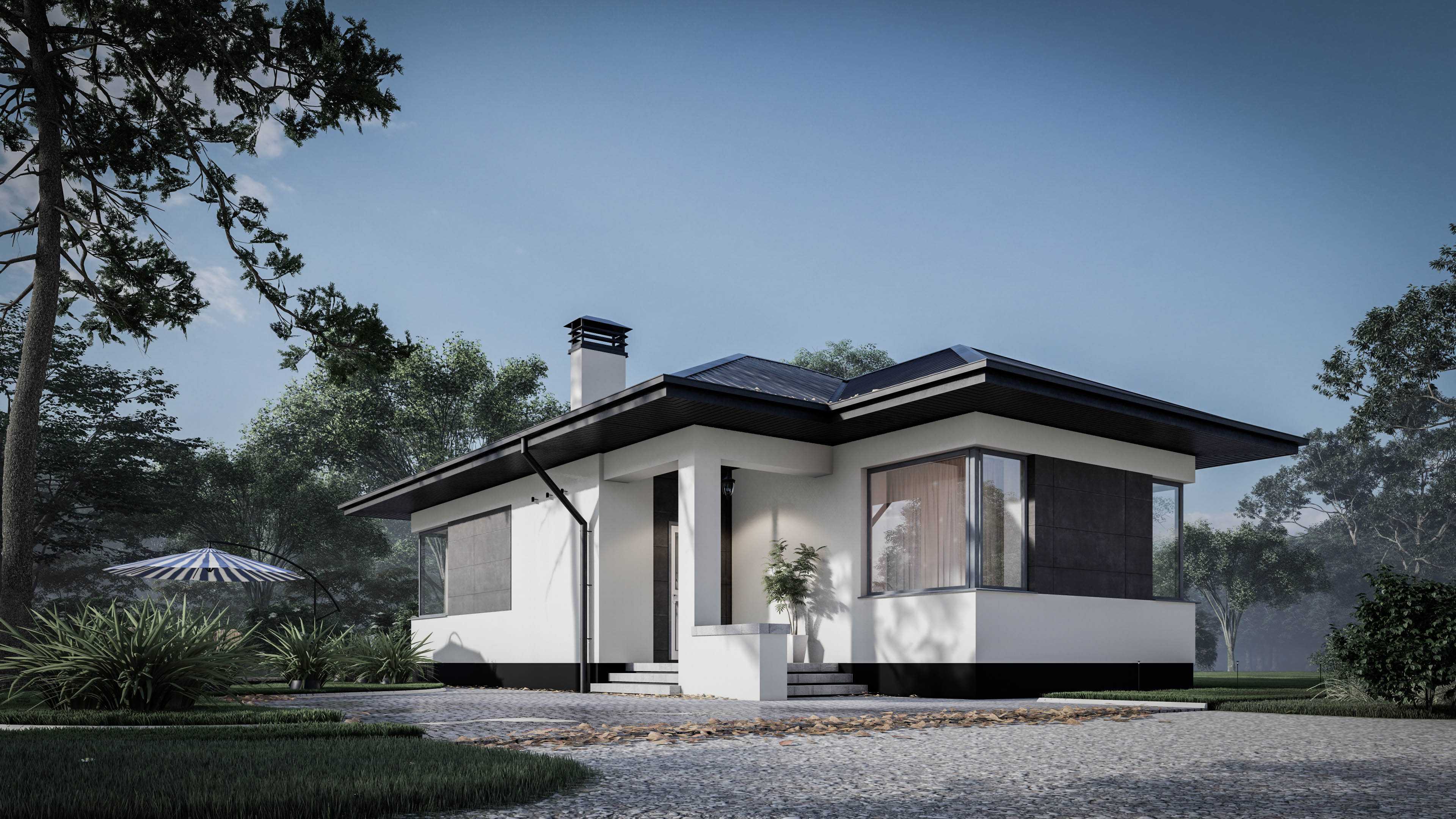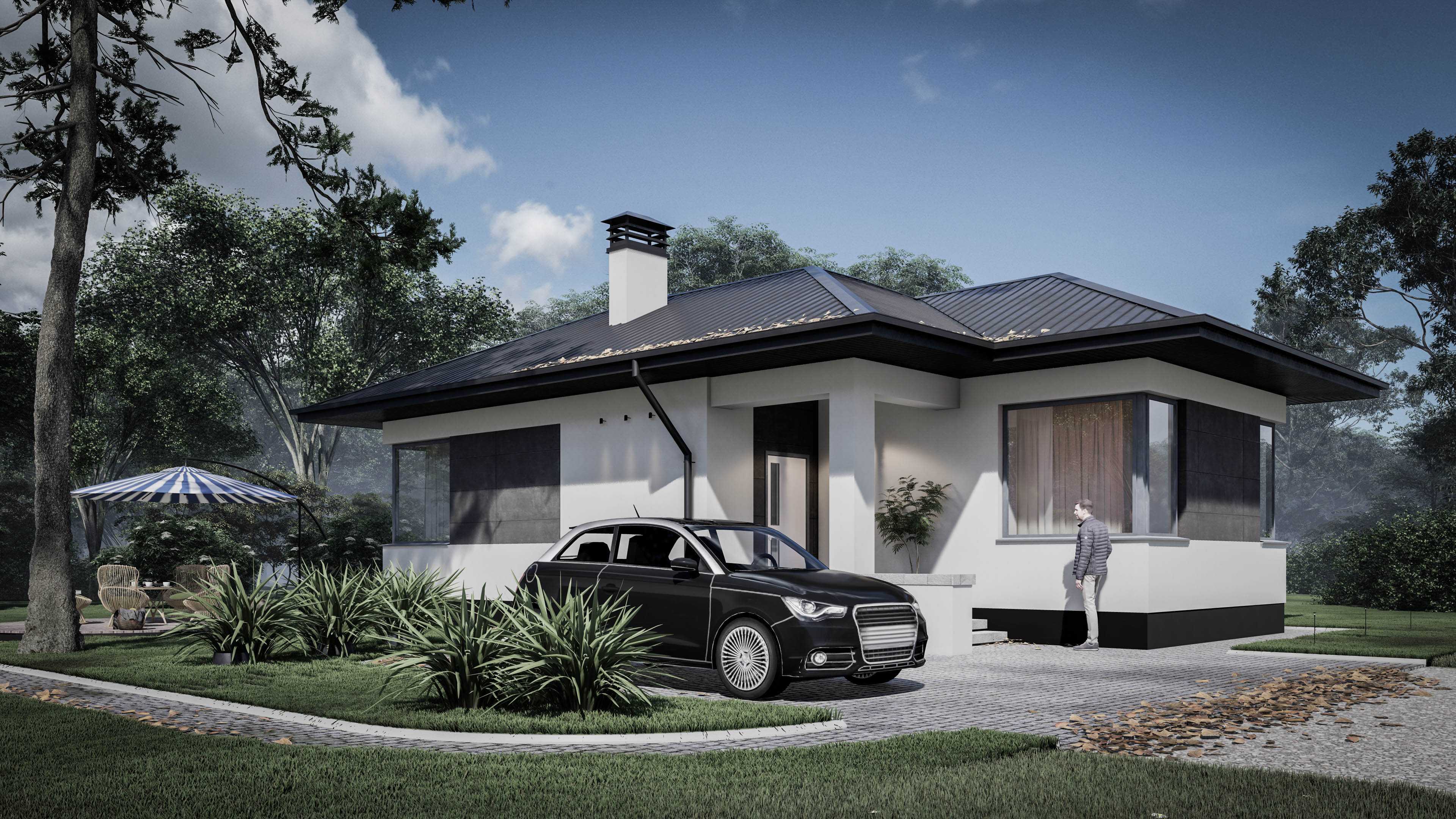 Готовий проект будинку. Одноповерховий будинок загальною площею 54,3 м2 для сім'ї із двох осіб. Розміщення будинку передбачається на земельних ділянках де присутні мережі - газ, електрика, водопостачання. площа забудови 84,4 м2
