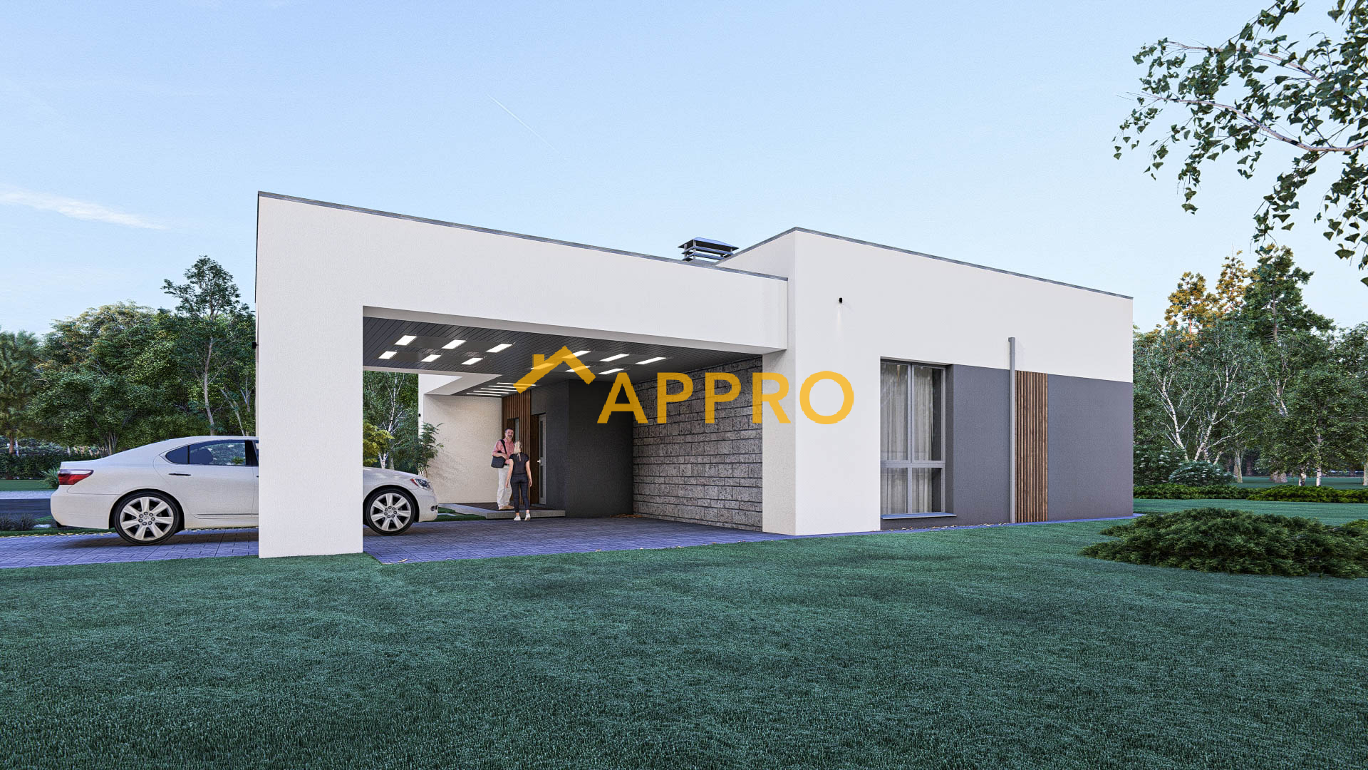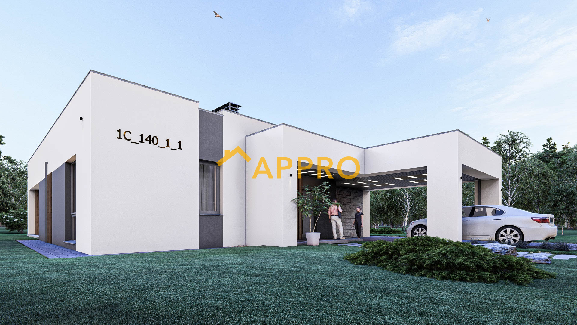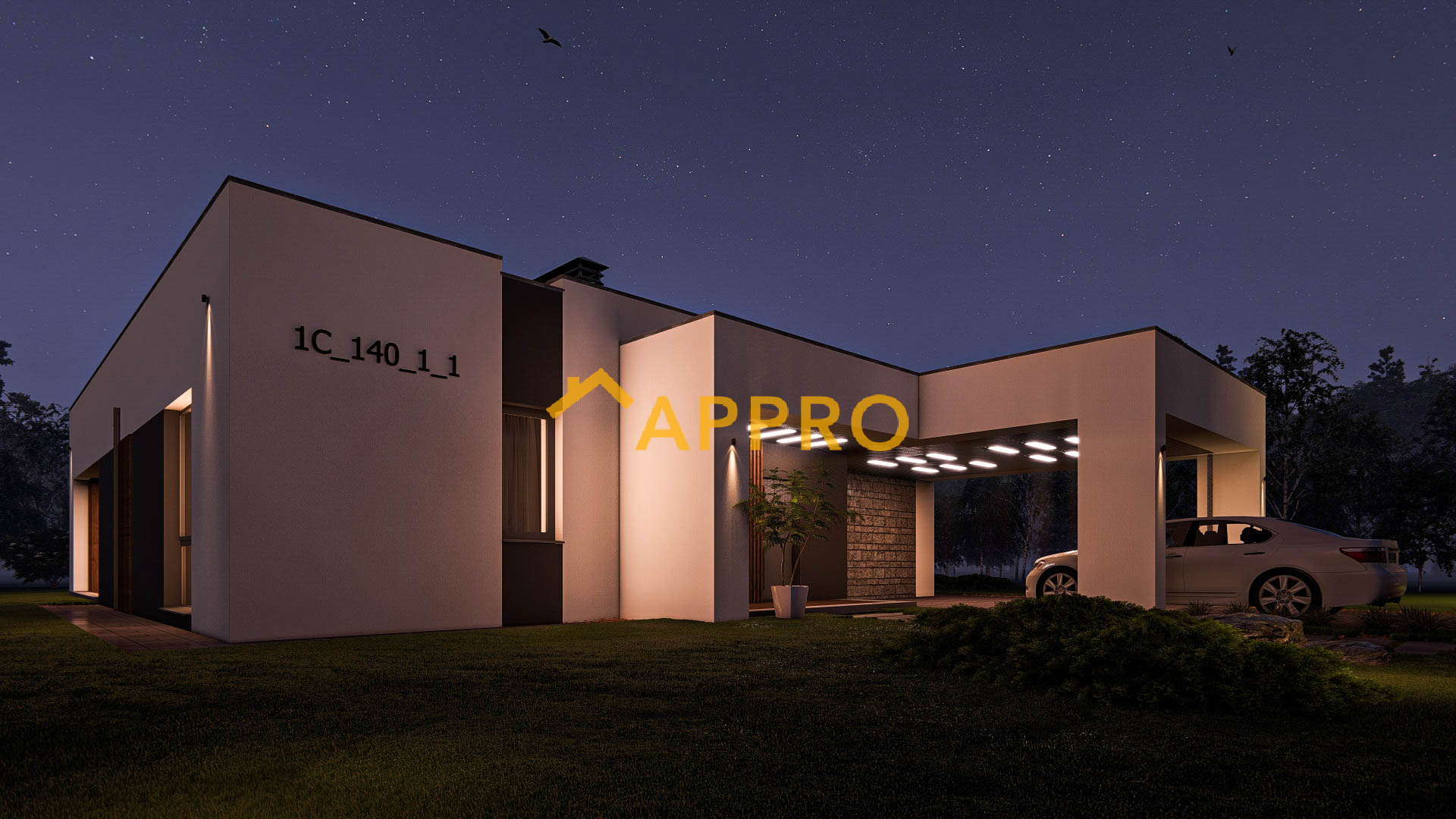 Готовий проект будинку. Одноповерховий будинок загальною площею 142,2 м.кв. Склад приміщень: 1. Тамбур 2,45 м2; 2. Коридор 19,26 м2; 3. Кухня-вітальня 43,45 м2; 4. Спальня з гардеробом (13,31 + 5,51) 18,82 м2; 5. Санвузол 6,77 м2; 6. Спальня 13,40м2; 7. Санвузол 3,54 м2; 8. Комора 0,94 м2; 9. Кабінет (гостьова кімната) 13,44 м2; 10. Санвузол гостьовий 4,08 м2; 11. Кладова 2,65 м2; 12. Котельня 4,99 м2. Будинок має навіс для автомобіля, що забезпечує зручне паркування. Навіс над входом та частиною тераси додає практичності, захищаючи від дощу чи сонця. Плоска покрівля не лише підкреслює сучасний стиль, але й може бути використана для встановлення сонячних панелей. Простора тераса, накрита навісом, ідеально підходить для відпочинку на свіжому повітрі. Вона може бути облаштована зоною для барбекю або лаундж-зоною з меблями для відпочинку. Матеріали та особливості: Зовнішнє оздоблення: комбінація штукатурки та декоративних панелей. Вікна: великі, енергозберігаючі, з темними рамами. Освітлення: вбудовані світильники на фасаді та під навісом створюють затишну атмосферу у вечірній час. Цей будинок ідеально підійде для невеликої сім’ї, яка цінує комфорт, сучасний дизайн та функціональність. Якщо Вам потрібно змінити товщину та матеріал стін - це не проблема!