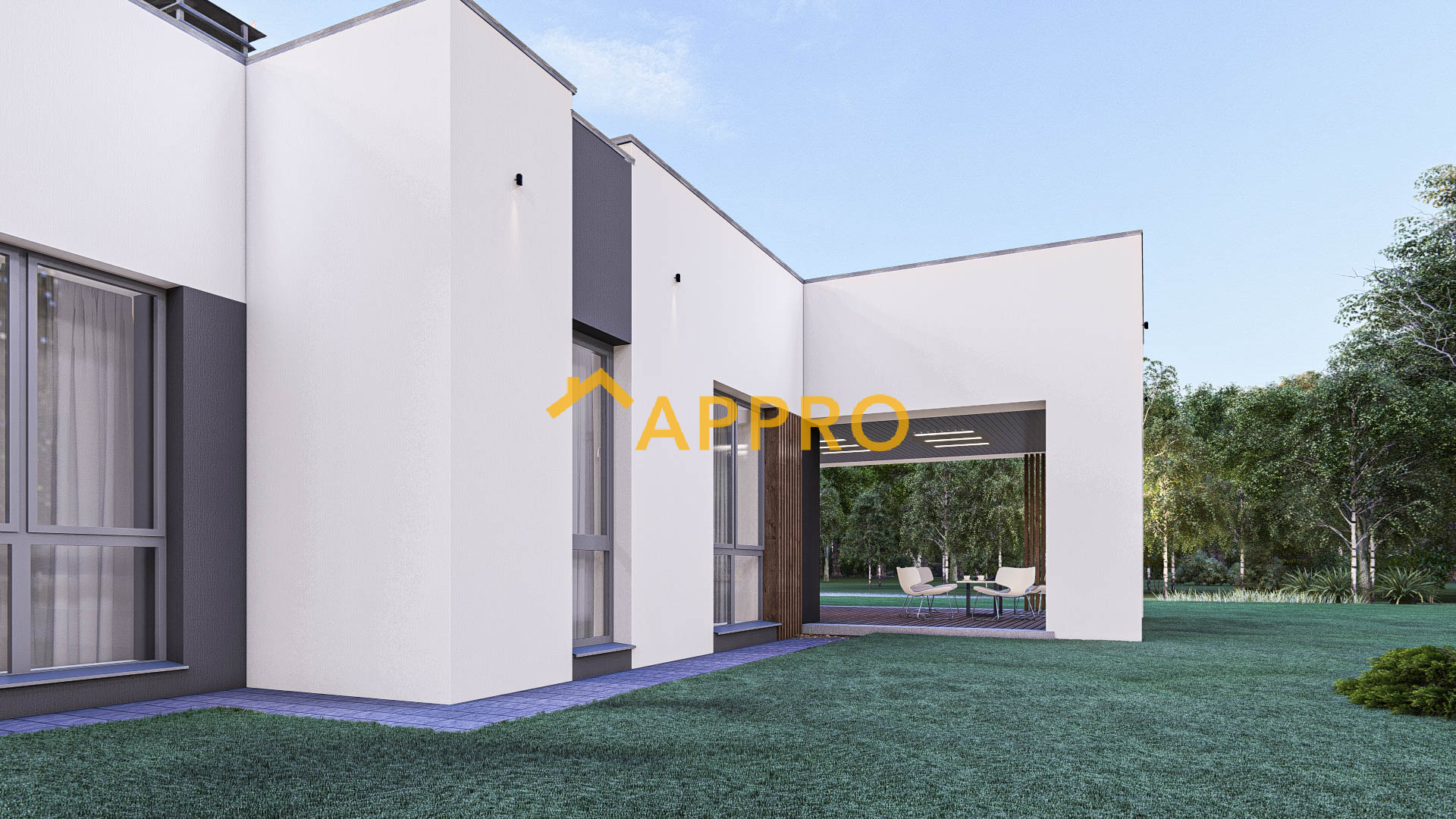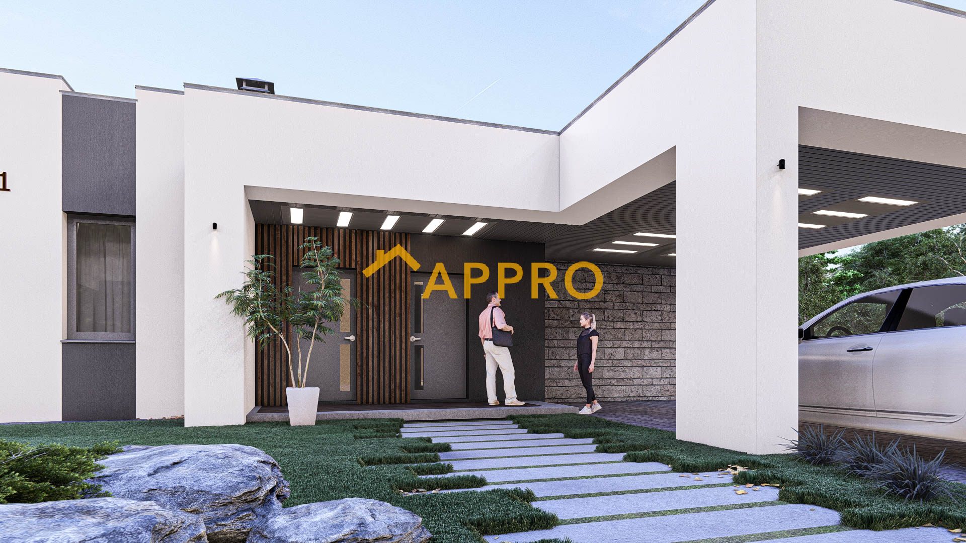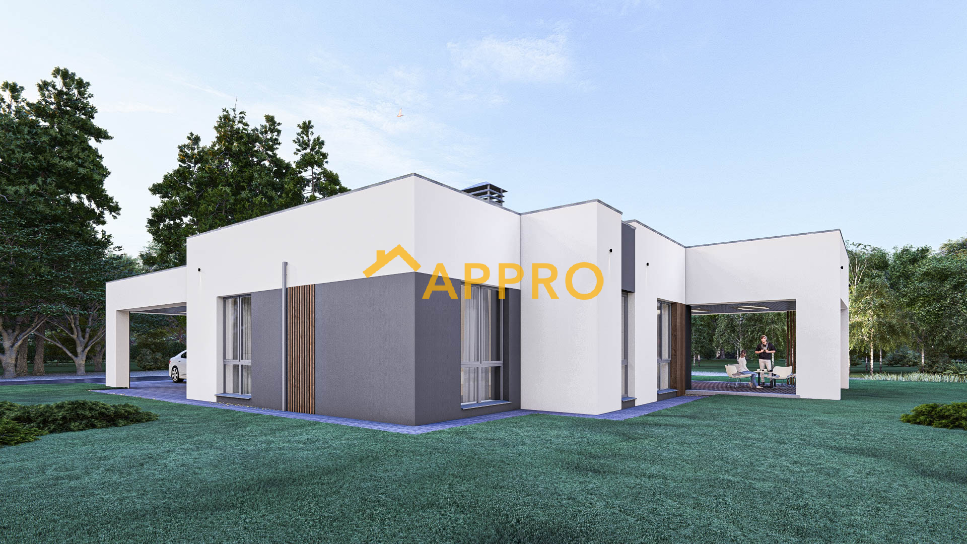 Готовий проект будинку. Одноповерховий будинок загальною площею 142,2 м.кв. Склад приміщень: 1. Тамбур 2,45 м2; 2. Коридор 19,26 м2; 3. Кухня-вітальня 43,45 м2; 4. Спальня з гардеробом (13,31 + 5,51) 18,82 м2; 5. Санвузол 6,77 м2; 6. Спальня 13,40м2; 7. Санвузол 3,54 м2; 8. Комора 0,94 м2; 9. Кабінет (гостьова кімната) 13,44 м2; 10. Санвузол гостьовий 4,08 м2; 11. Кладова 2,65 м2; 12. Котельня 4,99 м2. Будинок має навіс для автомобіля, що забезпечує зручне паркування. Навіс над входом та частиною тераси додає практичності, захищаючи від дощу чи сонця. Плоска покрівля не лише підкреслює сучасний стиль, але й може бути використана для встановлення сонячних панелей. Простора тераса, накрита навісом, ідеально підходить для відпочинку на свіжому повітрі. Вона може бути облаштована зоною для барбекю або лаундж-зоною з меблями для відпочинку. Матеріали та особливості: Зовнішнє оздоблення: комбінація штукатурки та декоративних панелей. Вікна: великі, енергозберігаючі, з темними рамами. Освітлення: вбудовані світильники на фасаді та під навісом створюють затишну атмосферу у вечірній час. Цей будинок ідеально підійде для невеликої сім’ї, яка цінує комфорт, сучасний дизайн та функціональність. Якщо Вам потрібно змінити товщину та матеріал стін - це не проблема!