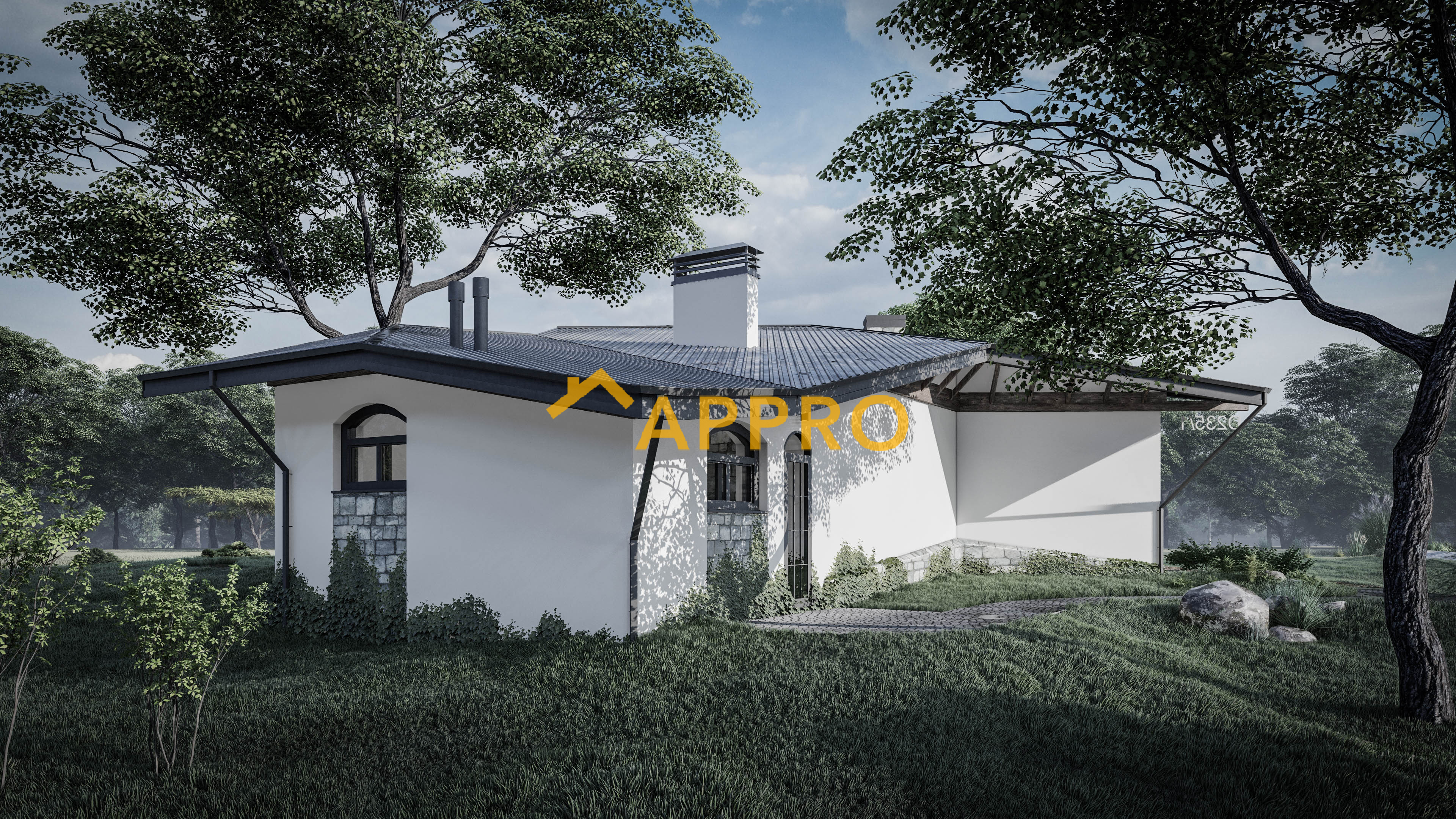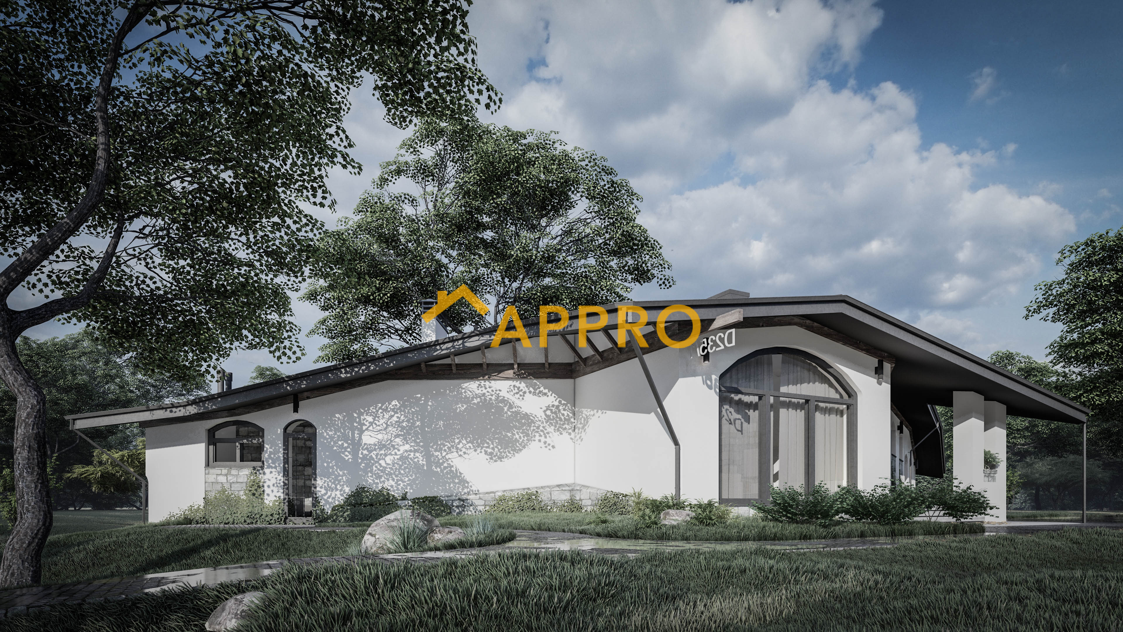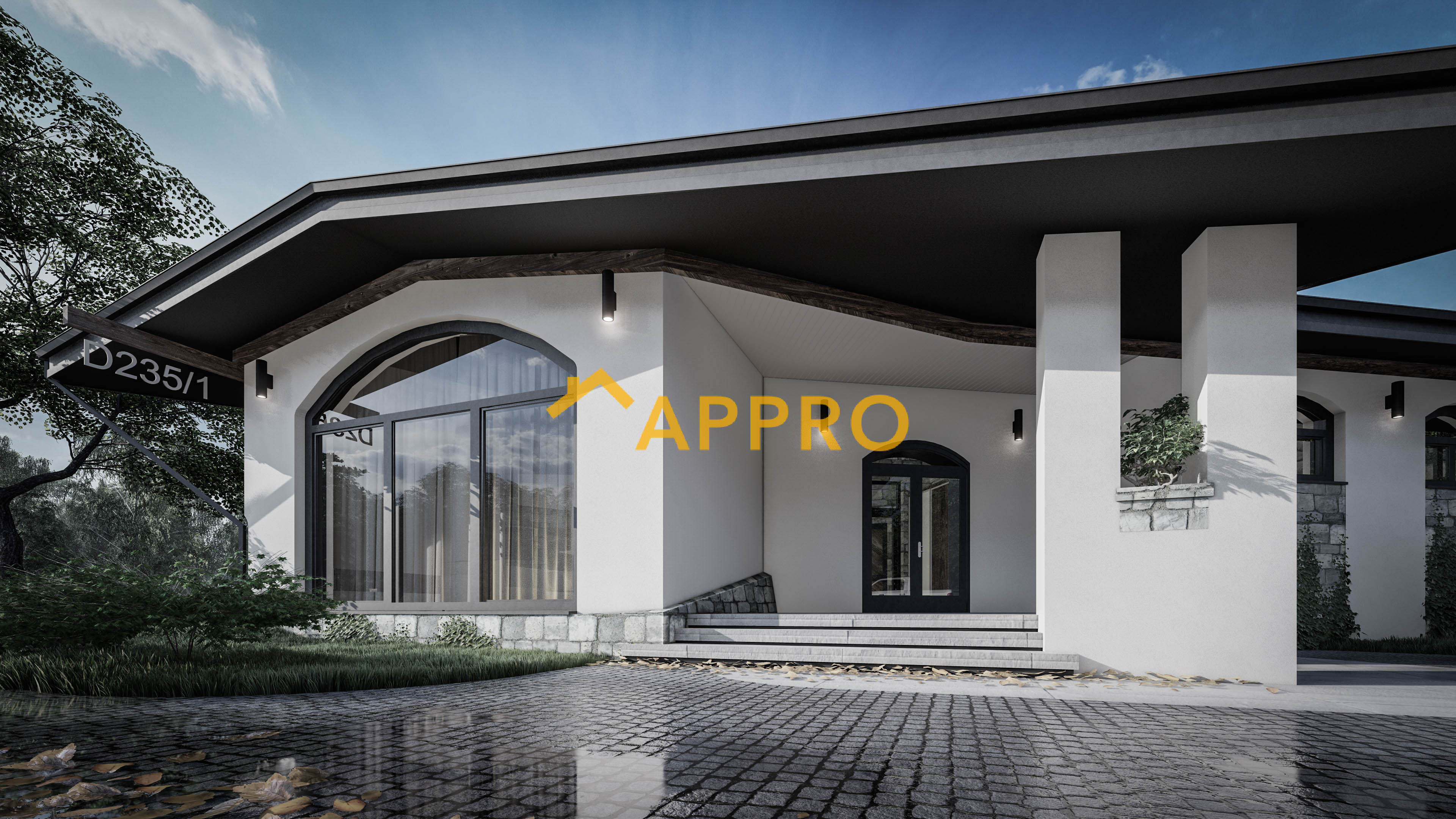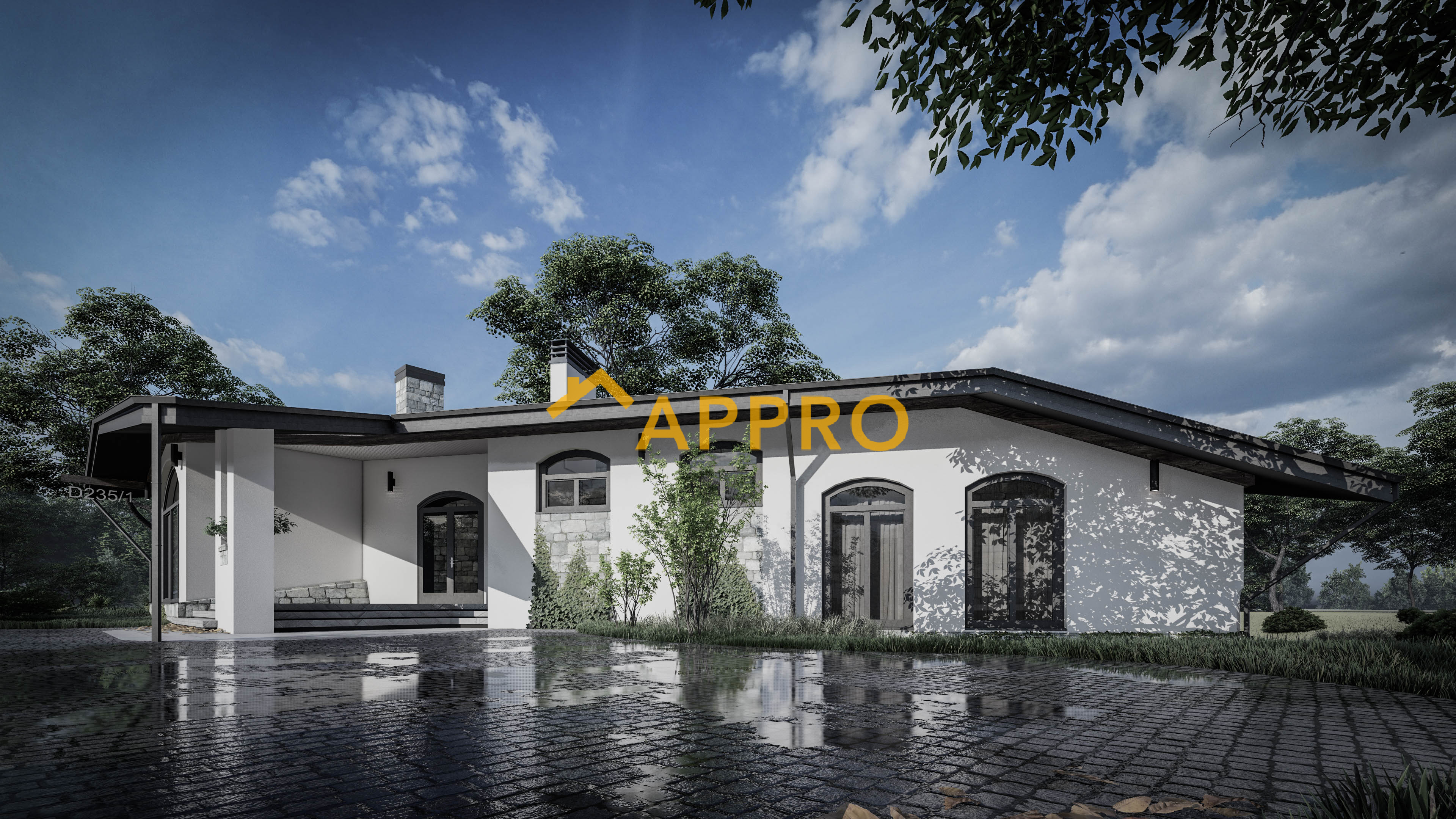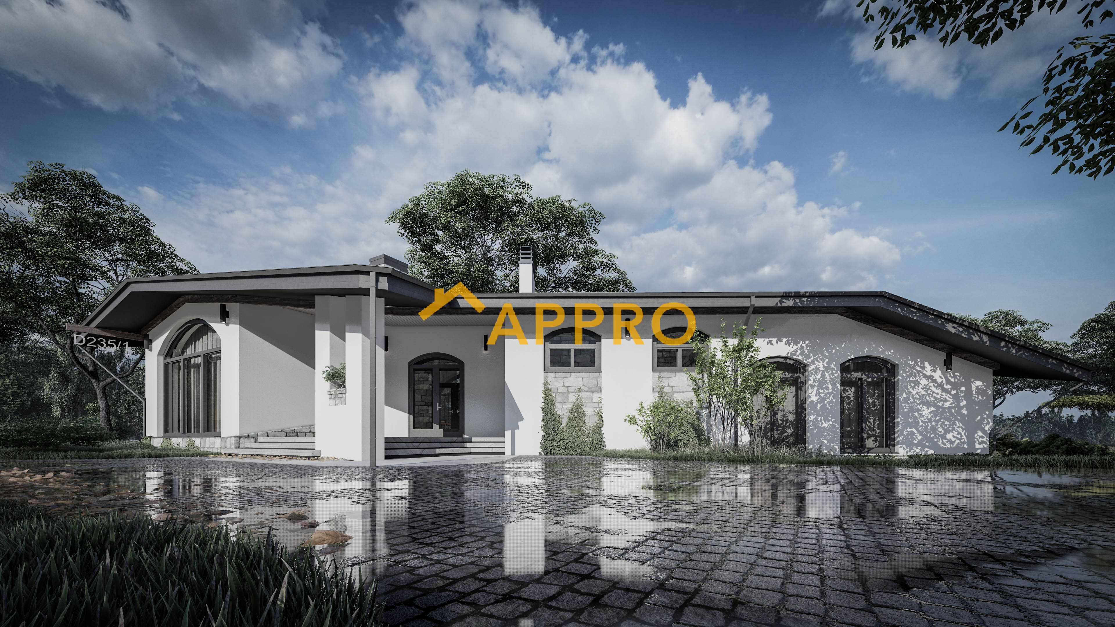 Готовий проект будинку. Житловий будинок D235 з великим ганком, просторою кухнею та вітальнею, чотири спальні та окремим господарським блоком.