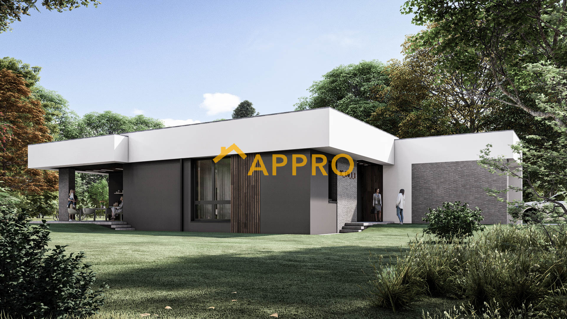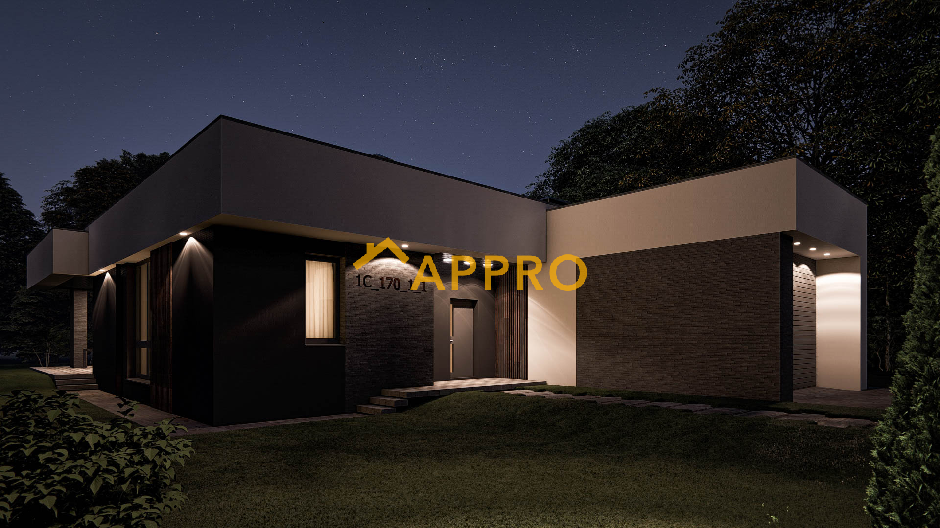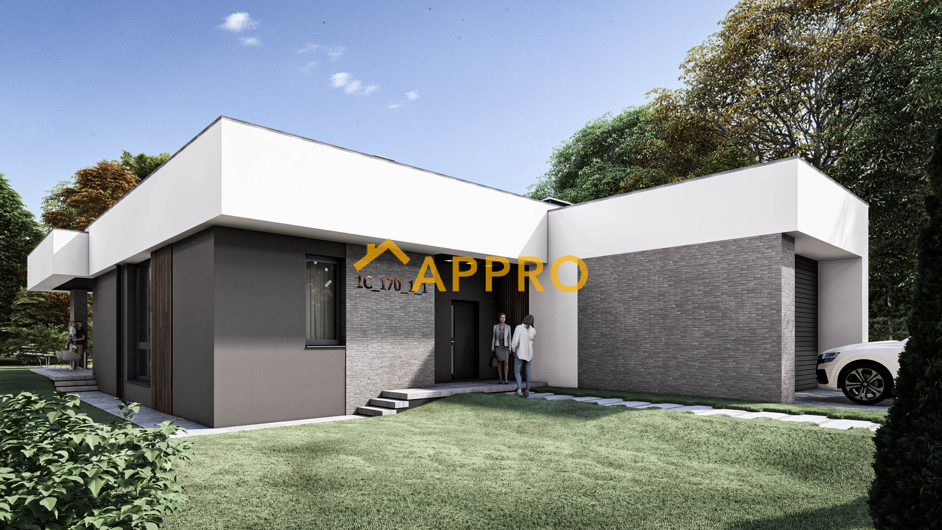 Сучасний одноповерховий будинок площею 172,3 м² з плоскою покрівлею виконаний у мінімалістичному стилі (планування як у проекті 2A_170). Фасад поєднує білу та темно-сіру штукатурку, вставки з рігельної цегли. Планування включає: вітальню (30,23 м²) з каміном, кухню (14,3 м²), три спальні (12,87 м², 11,94 м², 10,38 м²), три санвузли (4,87 м², 6,92 м², 2,86 м²), гардероб (6,23 м²), техприміщення (7,47 м²) та гараж (27,76 м²). Тераса (31,73 м²) з терасною дошкою та навісом ідеальна для відпочинку. Освітлення: вбудовані світильники на терасі та фасаді створюють приємну атмосферу у вечірній час. Додаткові елементи: дерев’яні вертикальні рейки на фасаді та терасі додають сучасного шарму, а кам’яне оздоблення підкреслює преміальний вигляд будинку. Цей будинок ідеально підійде для сім’ї, яка цінує сучасний дизайн, комфорт і можливість проводити час на свіжому повітрі завдяки просторій терасі.