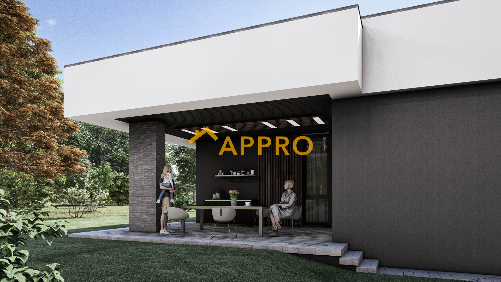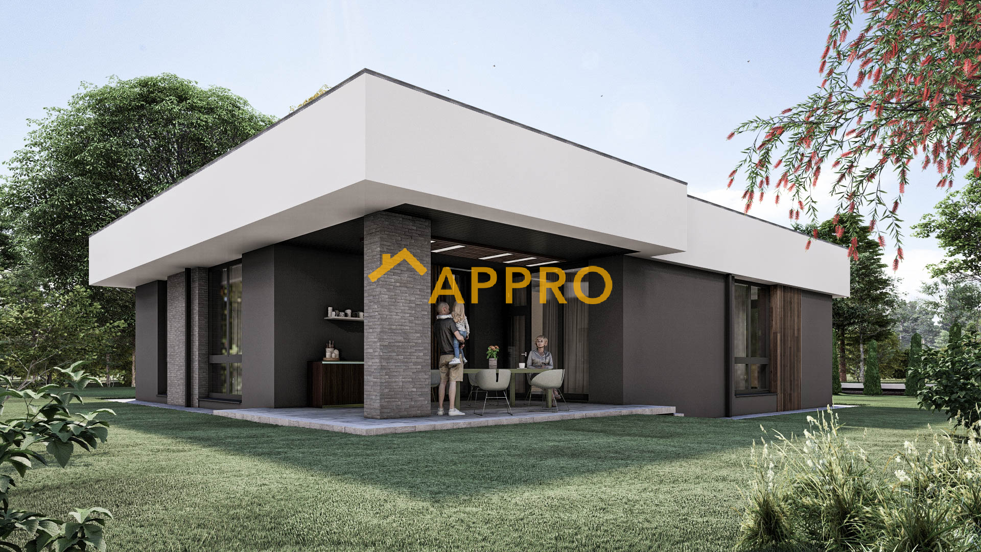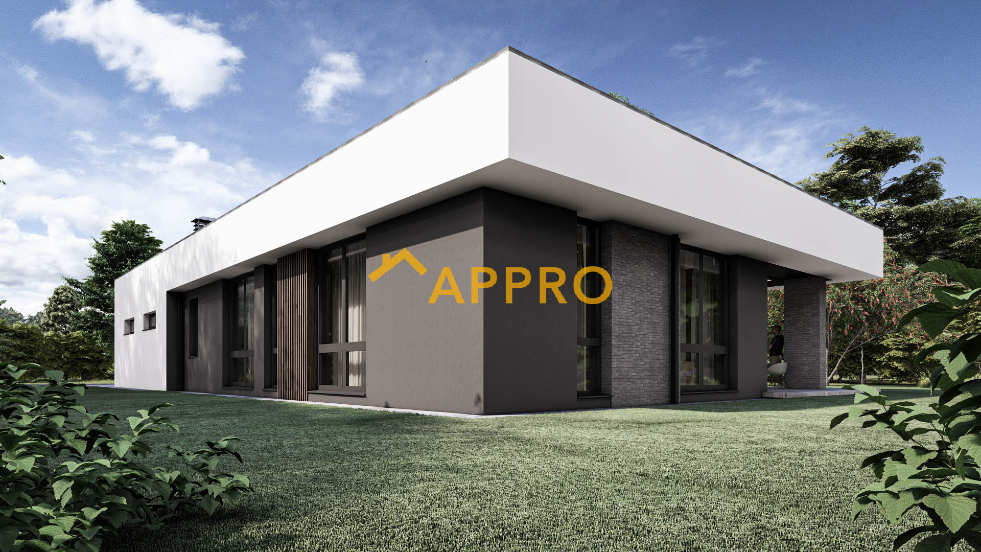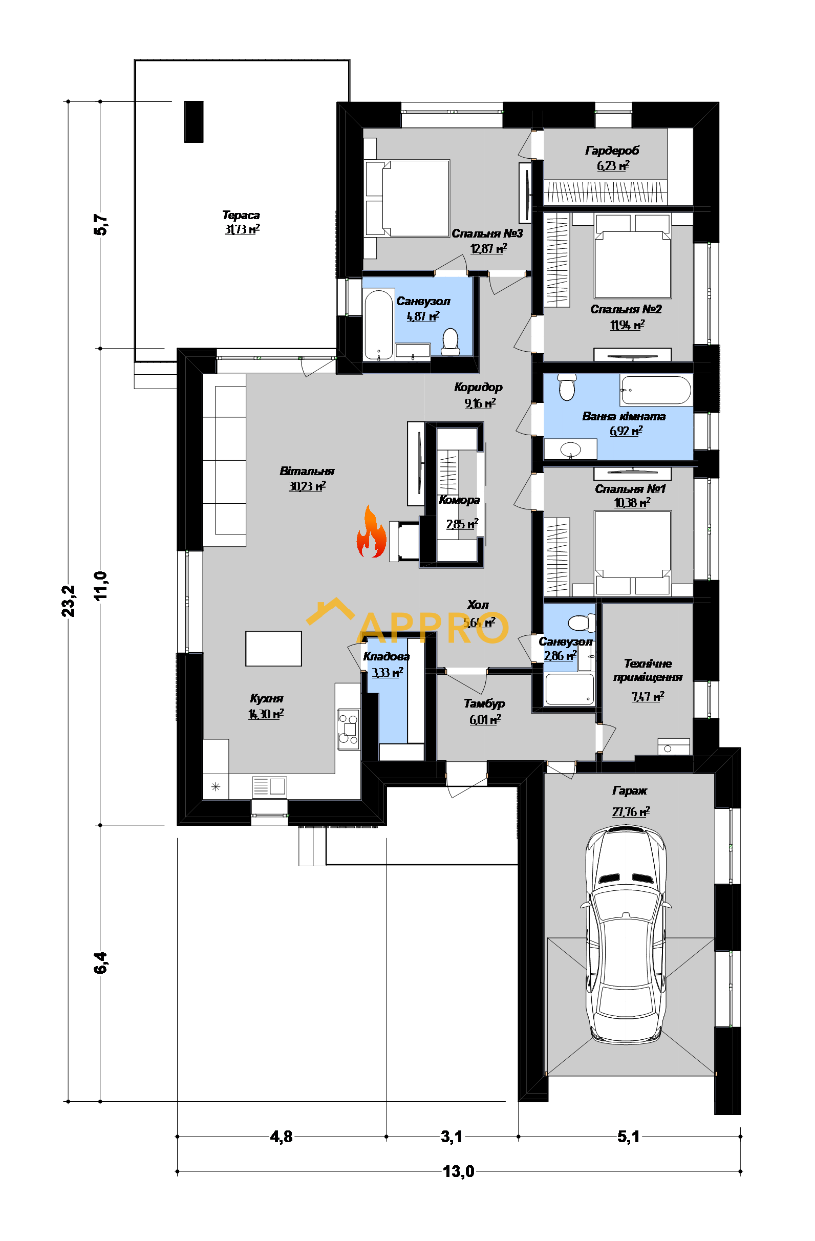 Сучасний одноповерховий будинок площею 172,3 м² з плоскою покрівлею виконаний у мінімалістичному стилі (планування як у проекті 2A_170). Фасад поєднує білу та темно-сіру штукатурку, вставки з рігельної цегли. Планування включає: вітальню (30,23 м²) з каміном, кухню (14,3 м²), три спальні (12,87 м², 11,94 м², 10,38 м²), три санвузли (4,87 м², 6,92 м², 2,86 м²), гардероб (6,23 м²), техприміщення (7,47 м²) та гараж (27,76 м²). Тераса (31,73 м²) з терасною дошкою та навісом ідеальна для відпочинку. Освітлення: вбудовані світильники на терасі та фасаді створюють приємну атмосферу у вечірній час. Додаткові елементи: дерев’яні вертикальні рейки на фасаді та терасі додають сучасного шарму, а кам’яне оздоблення підкреслює преміальний вигляд будинку. Цей будинок ідеально підійде для сім’ї, яка цінує сучасний дизайн, комфорт і можливість проводити час на свіжому повітрі завдяки просторій терасі.