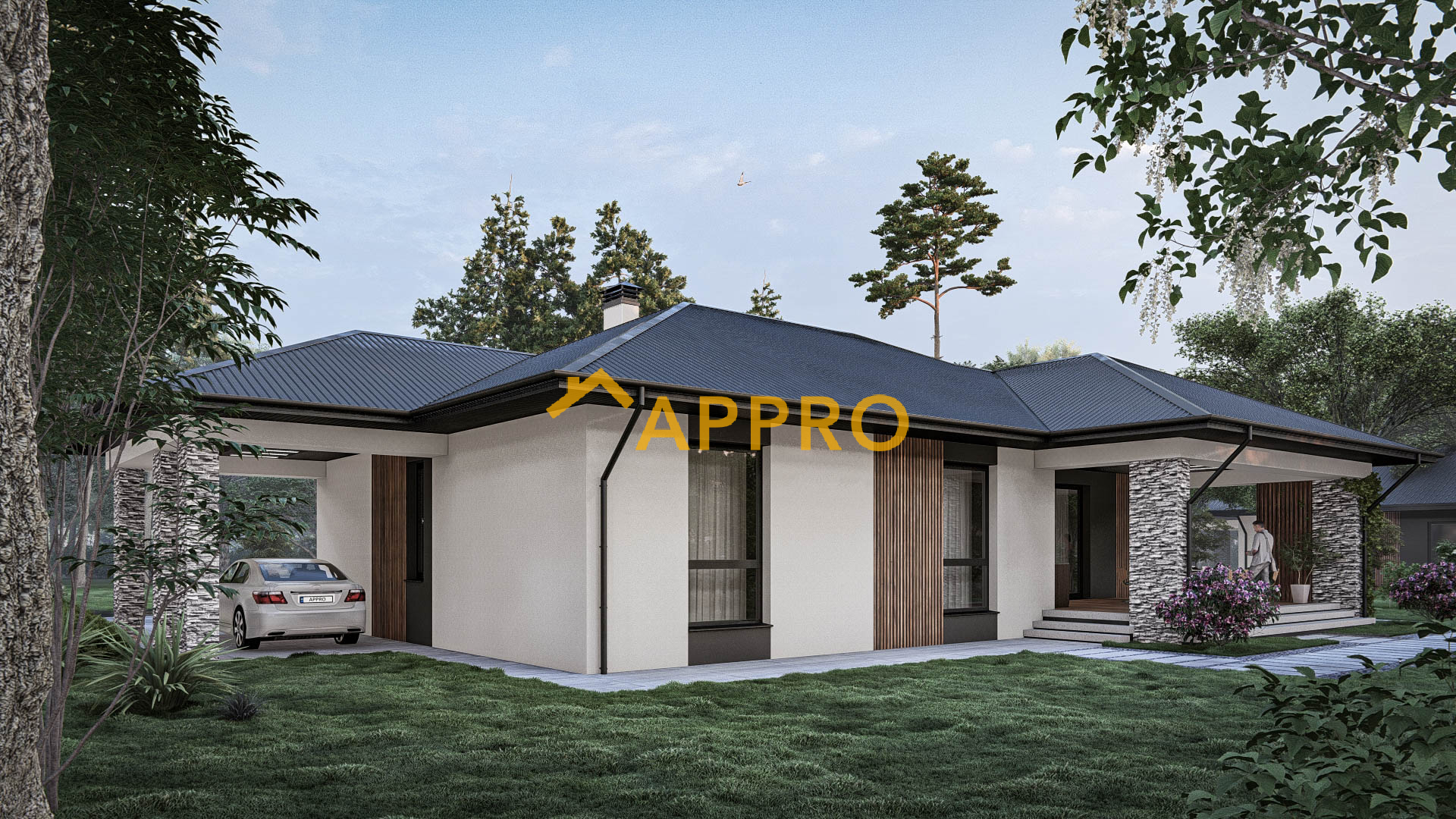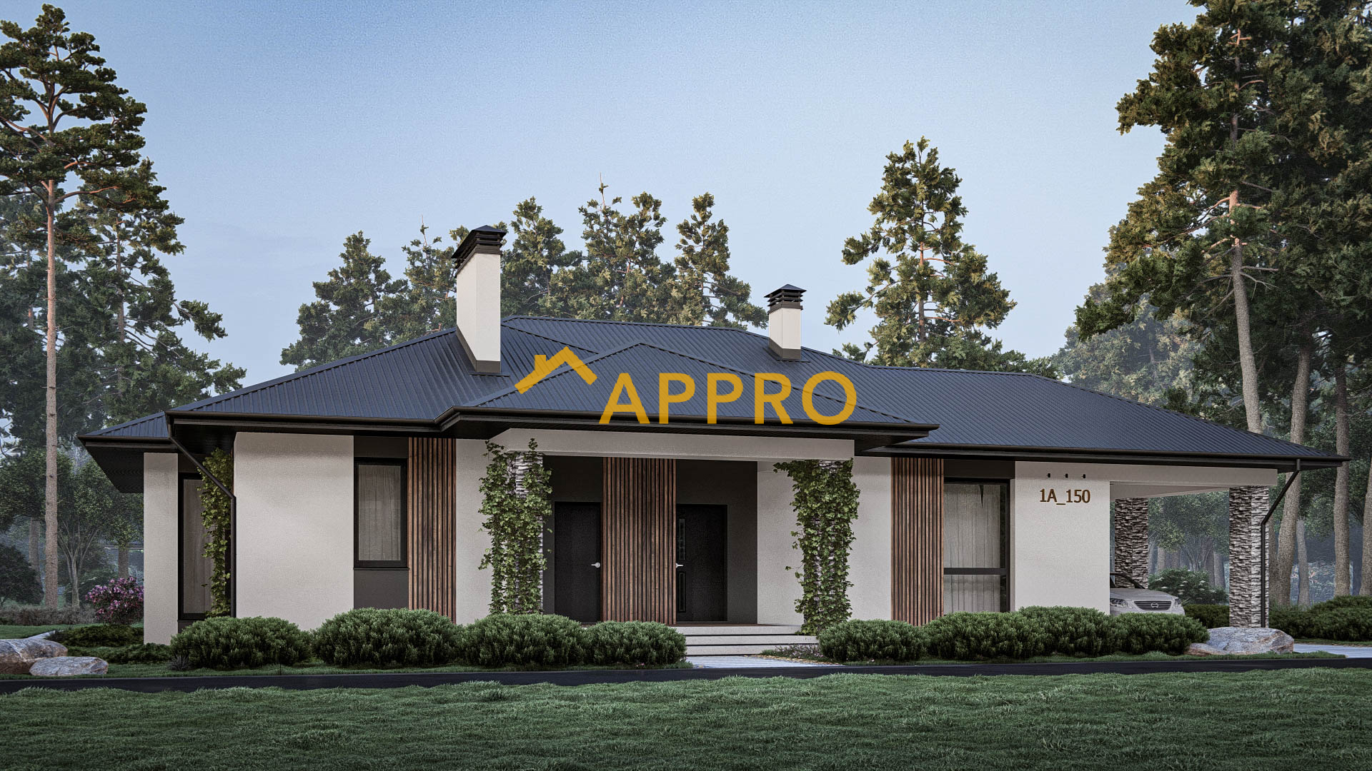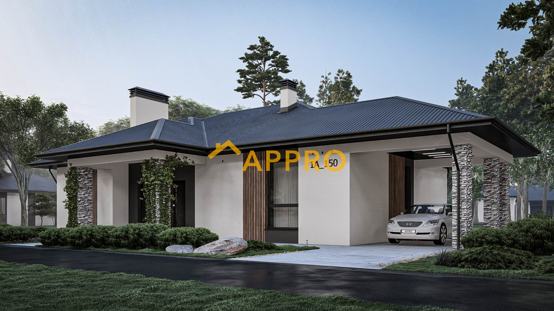 Готовий проект будинку. Компактний сучасний одноповерховий будинок 1А_150 з великим інтегрованим навісом для авто. Три спальні з гардеробними, велика кухня-вітальня з виходом на терасу, два санвузли та техприміщення. Дах темно-сірого кольору з широкими виносами, світлий фасад з акцентами графітового та дерев’яних вертикальних панелей. Кам’яні стовпи та облицювання входу/навісу додають солідності. Ідеально для невеликої родини, що цінує простоту та якість.