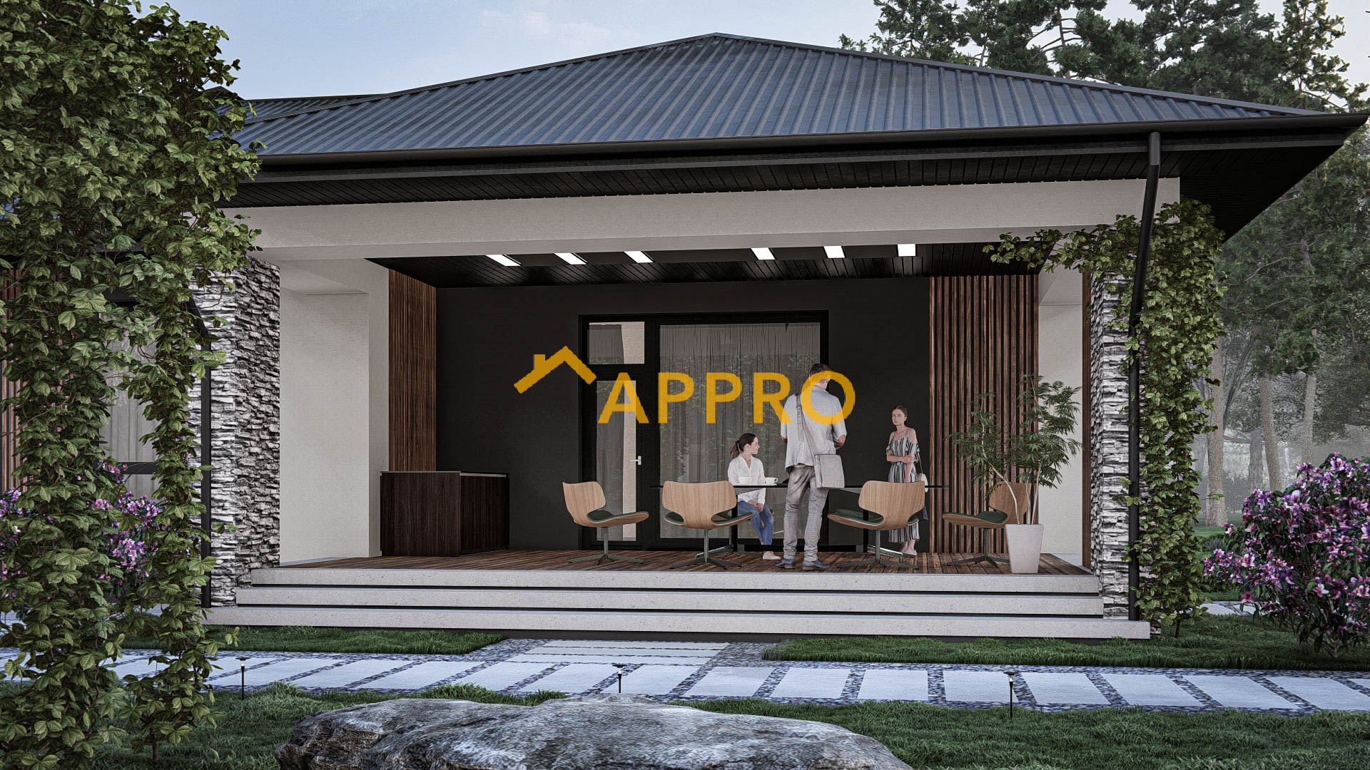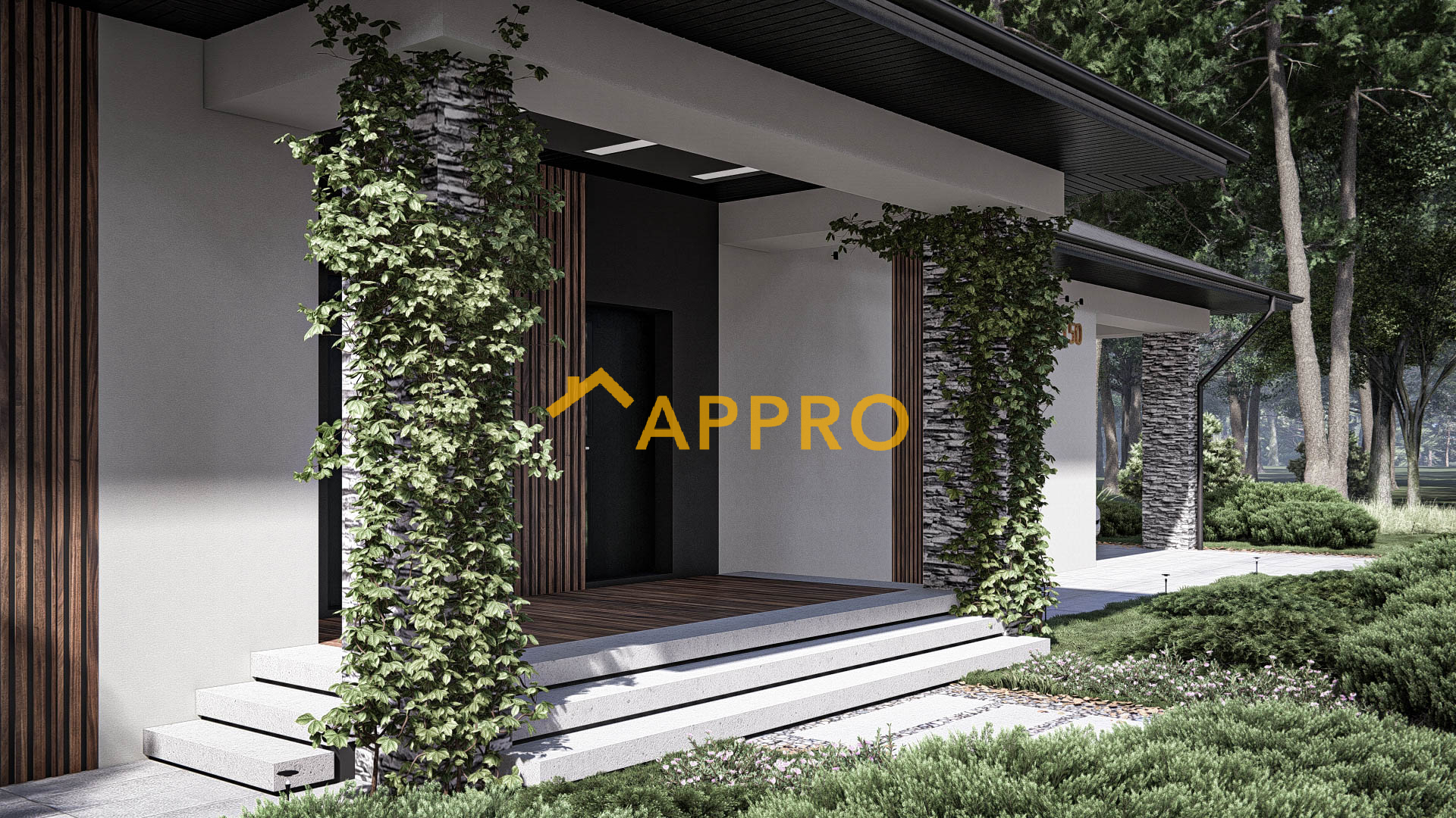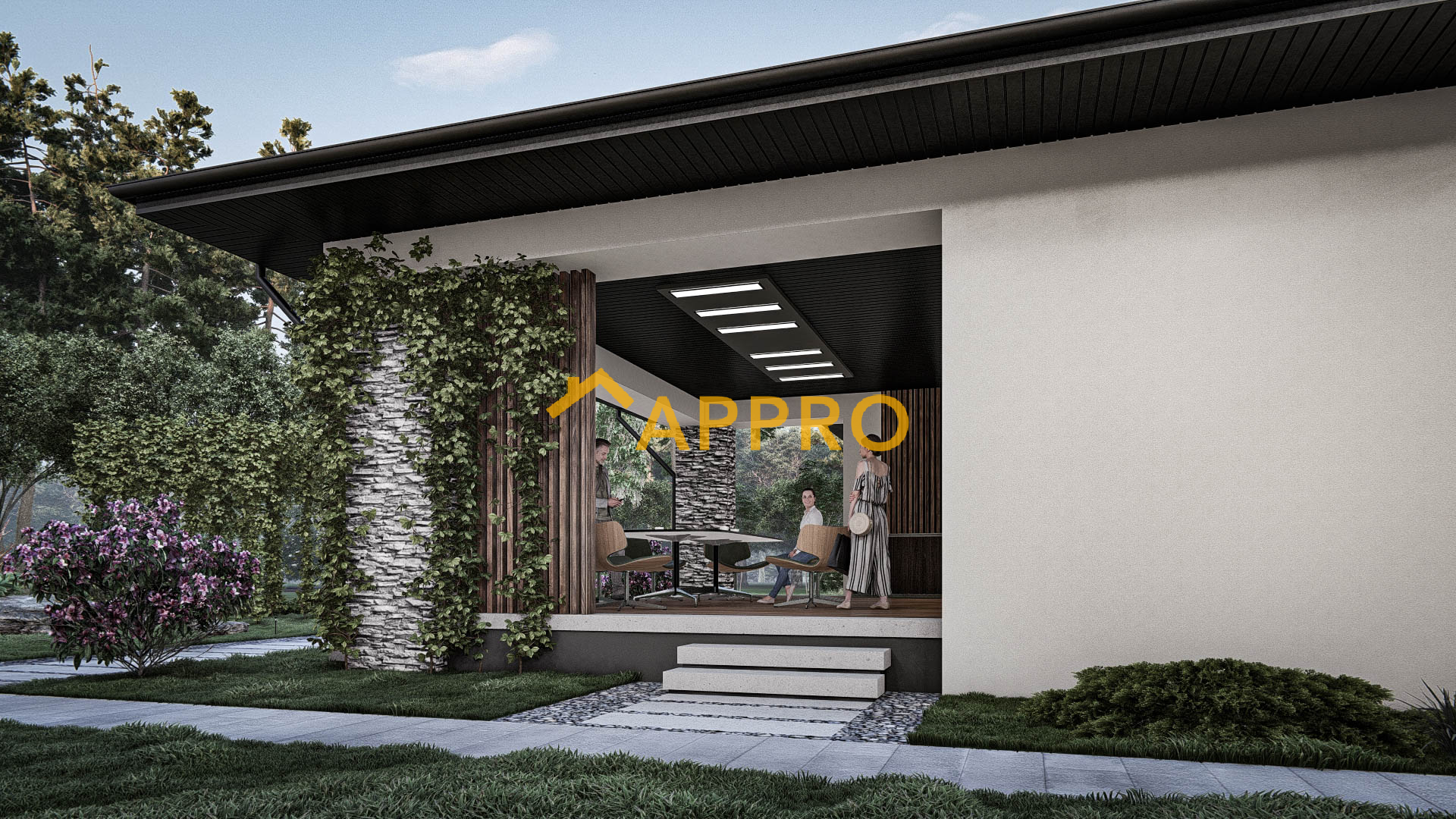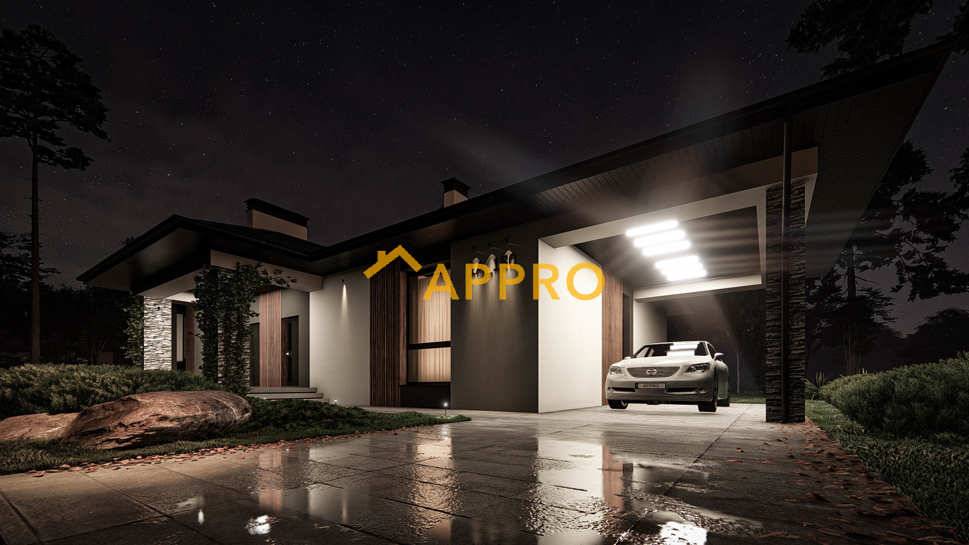 Готовий проект будинку. Компактний сучасний одноповерховий будинок 1А_150 з великим інтегрованим навісом для авто. Три спальні з гардеробними, велика кухня-вітальня з виходом на терасу, два санвузли та техприміщення. Дах темно-сірого кольору з широкими виносами, світлий фасад з акцентами графітового та дерев’яних вертикальних панелей. Кам’яні стовпи та облицювання входу/навісу додають солідності. Ідеально для невеликої родини, що цінує простоту та якість.